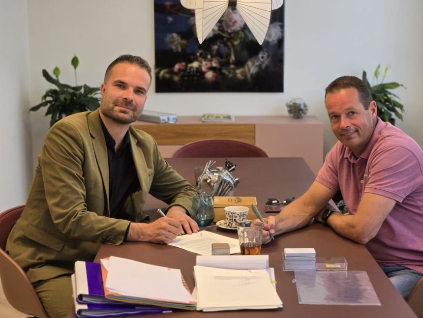 Op deze foto zien wij Arno Tange (rechts) en Roel van der Heijden (links) die de handen ineenslaan om Match-14 op te richten bij de notaris. Met hun gedeelde visie willen zij een detacheringsbureau neerzetten waarin korte lijnen, heldere afspraken, betrouwbaarheid en de wens van de medewerkers centraal staan. Arno Tange, die 17 jaar geleden Nehemia Projectmanagement oprichtte en waar inmiddels 160 medewerkers werkzaam zijn, brengt zijn jarenlange ervaring in projectmanagement mee. Roel van der Heijden is ruim 6 jaar actief in de wereld van detachering aan lokale overheden. Samen bundelen zij hun kennis en ervaring om Match-14 te laten groeien tot een werkgever waar het werkgeluk van hun medewerkers centraal staan.